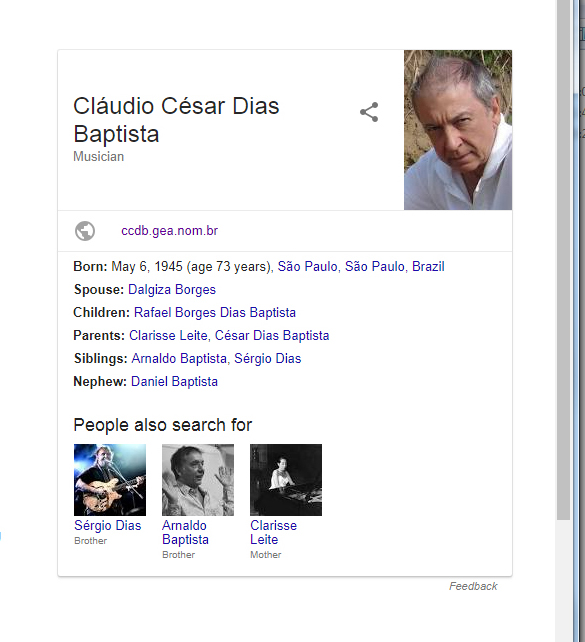 As Google is the same company where the responsibles for the suggestions to edit the KP and you three above work, and as you three are the only contact I reached in these several years, I hope this same ambient of work will let you do something, the possible, to help Google Team solve the issues that are showing for long term in the KP result of search via Google for my name “Cláudio César Dias Baptista”.